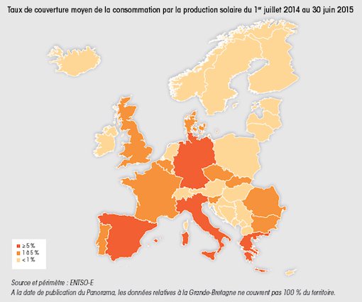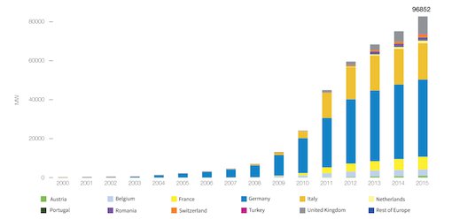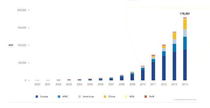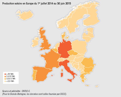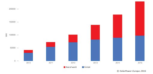 L'Europe représente 42 % de la puissance photovoltaïque au niveau mondiale avec presque 100 GW raccordée sur son réseau. Cette part ne cesse de décroître, puisqu'en 2014 l'Europe avait encore 50% de la puissance totale raccordée.