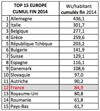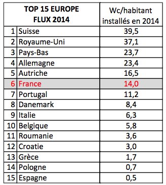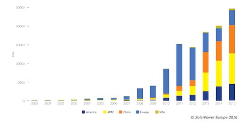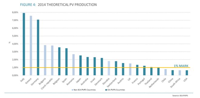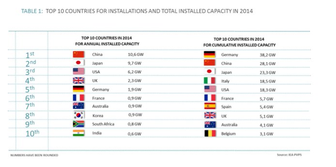 En 2015 la Chine et le Japon ont raccordé plus de puissance photovoltaïque que l'Europe toute entière. En 2015, la Chine prend la première place en terme de puissance photovoltaïque raccordée avec près de 43 GW, reléguant l'Allemagne à la deuxième place avec 40 GW.