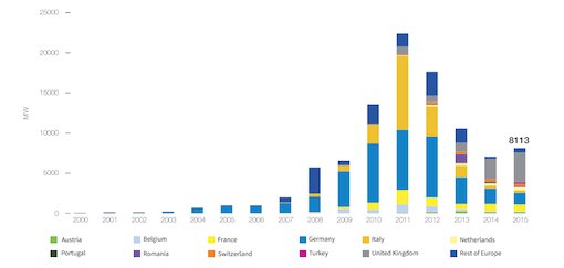 Le marché photovoltaïque européen est devenu le premier marché mondial en 2004, entraîné par l'Allemagne. Bien que la puissance raccordée au réseau cumulée européenne continue d'être la plus importante, son marché annuel est en décroissance, depuis 2012.
