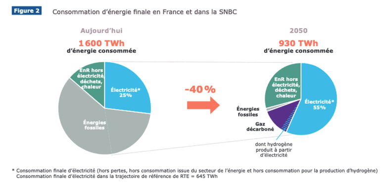 En France, à horizon 2050, une hausse générale de la consommation d’électricité est à prévoir, principalement du fait de l’électrification des usages et ce malgré les progrès dans l’efficacité énergétique des équipements électriques et la rénovation des bâtiments. D’après RTE, en fonction des trajectoires envisagées, la consommation d’électricité passerait de 480 TWh en 2020 à environ 645 TWh en 2050 (de 550 à 770 TWh selon les scénarios envisagés). D’autres scénarios, tel que ceux construits par l’association négaWatt, envisagent une réduction de la consommation énergétique plus prononcée et une électrification moindre conduisant à des niveaux plus faibles de consommation électrique à 2050 (463 TWh dans le scénario publié en 2017).
