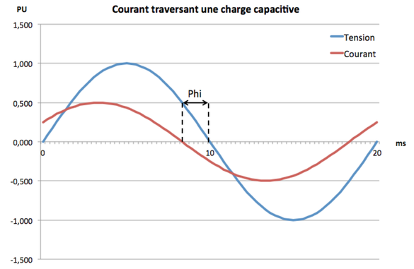 Figure 5 - le courant traversant une charge capacitive est en avance par rapport à la phase tension