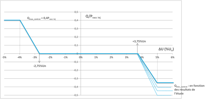 De plus, « Lorsque la tension au point de raccordement s'écarte de la tension contractuelle de plus de 5 % et dans la limite de 10 %, l'unité de production doit pouvoir moduler sa production ou sa consommation de puissance réactive dans les limites d'un domaine de fonctionnement minimal défini dans la documentation technique de référence du gestionnaire du réseau public de distribution d'électricité sous la forme d'un diagramme [U, Q]. »