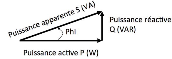 Cette consommation de puissance réactive entraine une augmentation de la puissance apparente S pour la maintenir la puissance effectivement utile au fonctionnement de la charge. Cette puissance active P exprimée en Watts (W) n’est donc plus qu’une fraction de la puissance S :