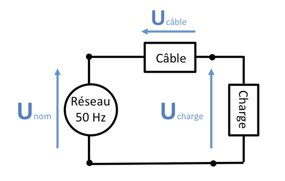 Lorsqu’une charge est branchée sur un réseau électrique, celle-ci génère une chute de tension due aux caractéristiques de la liaison électrique reliant la charge à la source de tension. Cette chute de tension dans le câble (Ucâble) va en effet entrainer une diminution de la tension observée aux bornes de la charge (Ucharge) qui sera donc inférieure à la tension nominale du réseau (Unom) compte tenu de la loi des mailles, encore appelée loi de Kirchoff, qui permet d’obtenir l’égalité (voir Figure 6) :